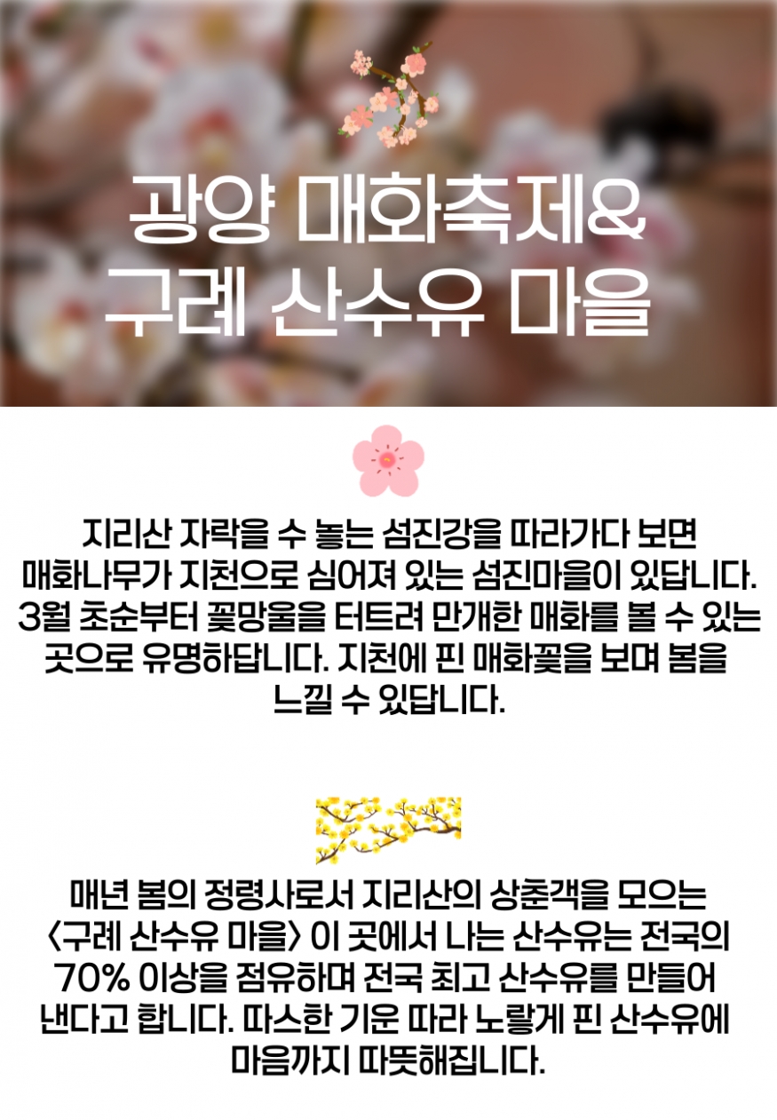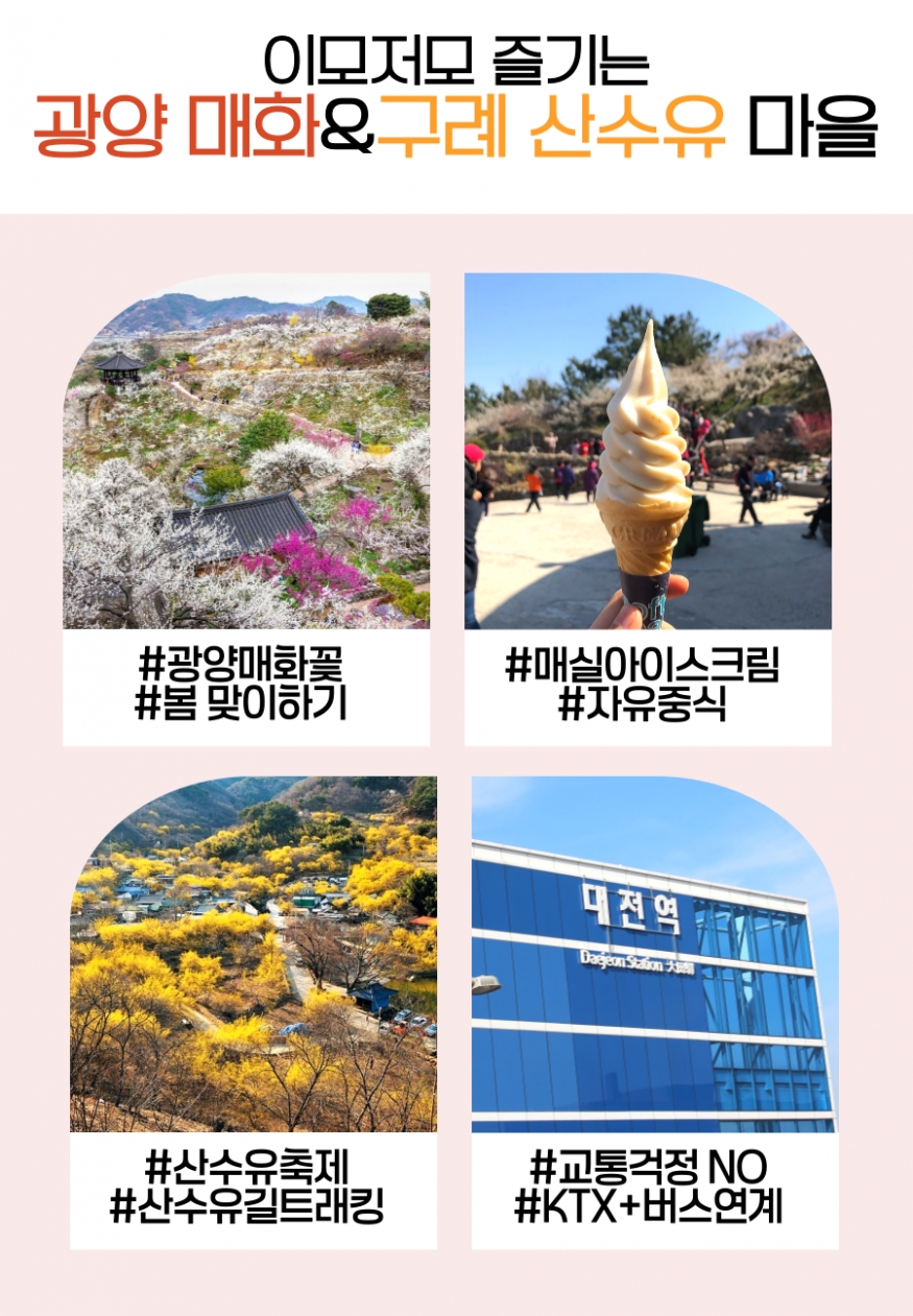 🚩흐드러지는 꽃! 광양 매화마을 →바람과 함께 휘날리는 매화꽃 세상~ →매실아이스크림, 특산품 판매 등 다양하게 축제를 즐겨보세요. →주차장~매화마을 입구까지 도보 15분 소요 →매화마을 내 식당가에서 🍴자유중식 ●매화마을 입장료 5,000원 별도이나 입장권 구매 시 매화마을 내에서 사용 가능한 상품권으로 환급됩니다.