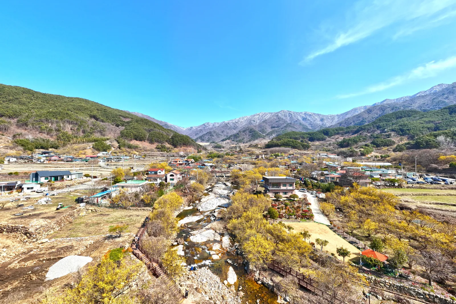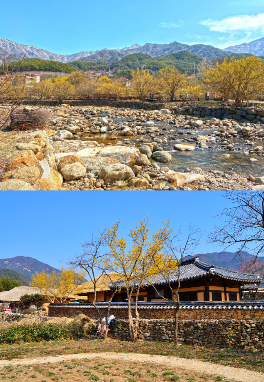 →산수유로 뒤덮힌 돌담 옆을 걸으며 봄을 만끽해보세요. ●차량 정체 시 산수유시목지로 대체될 수 있습니다.