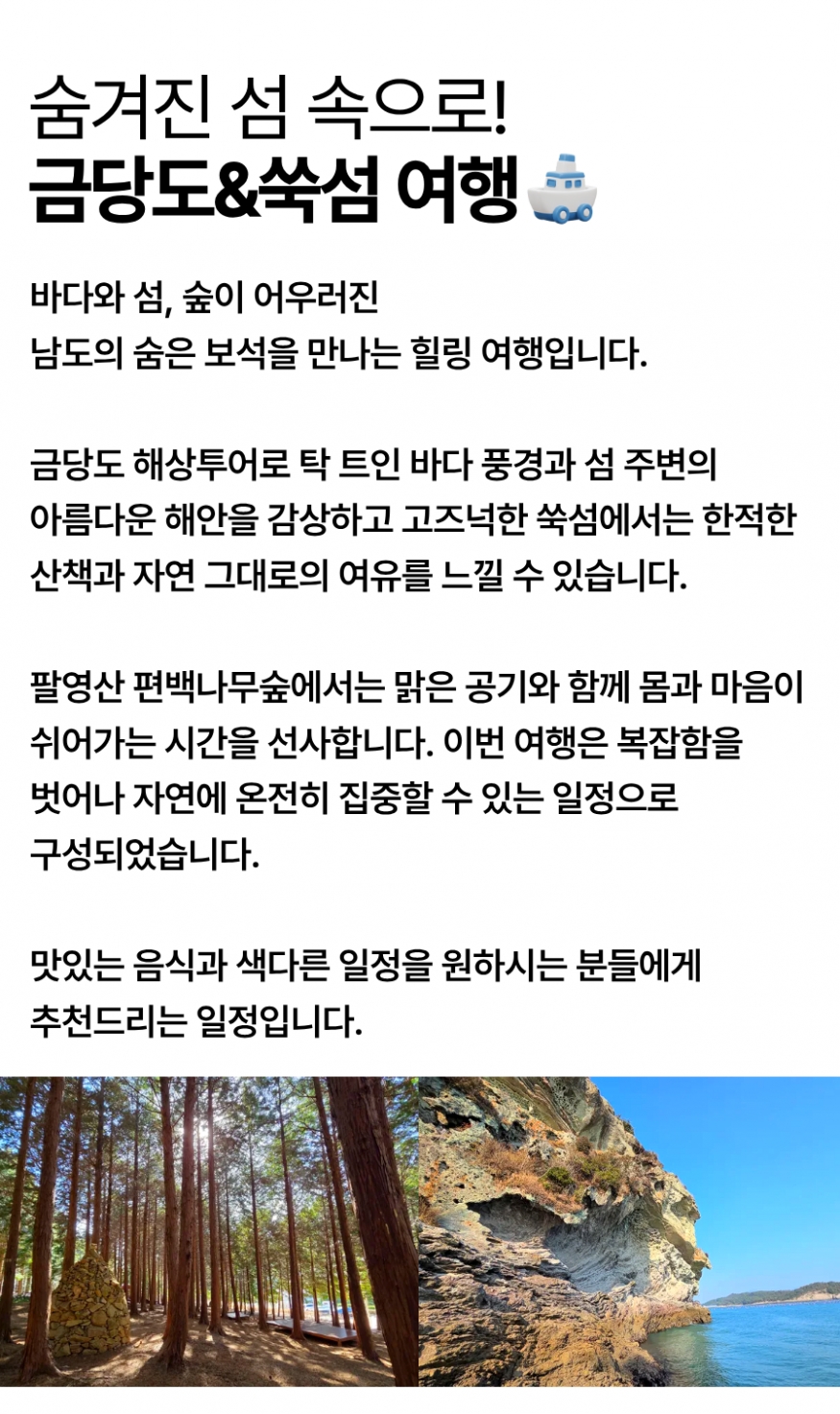 🚩금당도 섬투어! 금당팔경 해상투어(약 2시간 소요) -남해의 푸른 바다와 섬마을 풍경이 어우러진 한적한 힐링 섬 -해상투어로 금당도의 아름다운 해상 풍경을 조금 더 가까이서 감상해보세요.