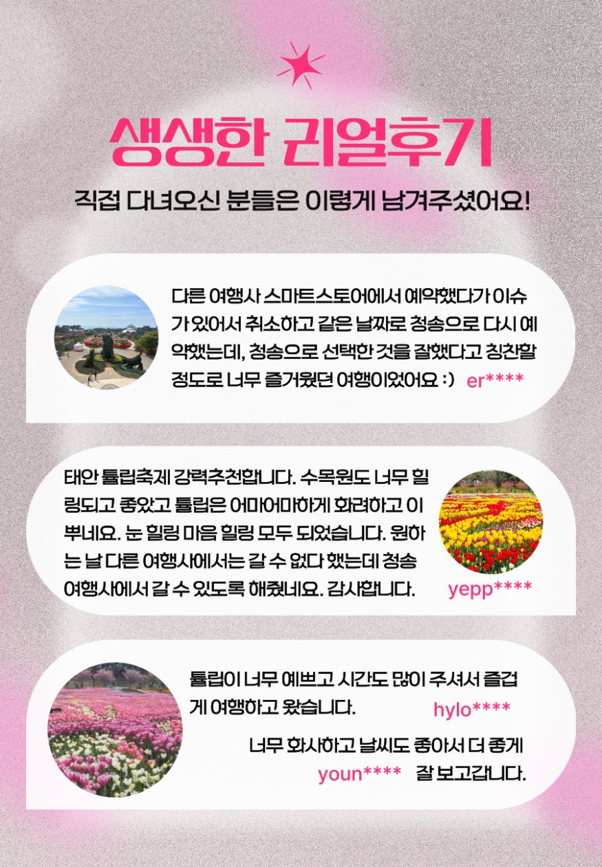 🌷2026 태안 세계튤립축제 즐기기! -미국,태나다,인도,일본과 함께 세계 5대 튤립축제로 선정된 태안 튤립축제! -튤립 뿐만 아니라 수선화, 백합 등 다양항 꽃들이 여러분을 기다리고 있습니다. -아름다운 튤립이 곳곳에! 바닥을 수놓은 알록 달록 튤립 속 예쁜 사진을 남겨보세요! [튤립축제 기간 26년 4월 1일~5월 6일]